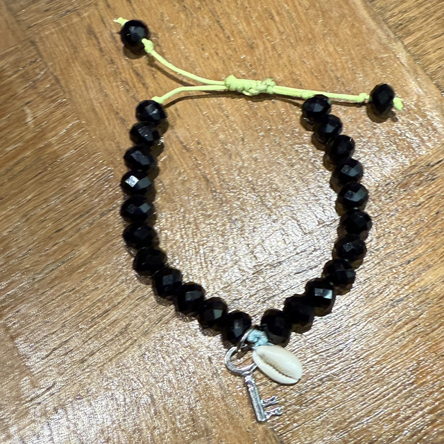 Composé de perles noires facettées, d’une clé symbolisant l’ouverture des chemins et d’un coquillage rappelant l’ancrage ancestral, il se porte comme un talisman moderne au quotidien.